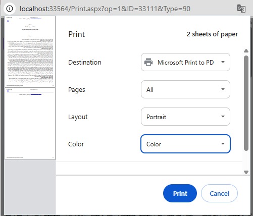 - وكذلك خاصية الطباعة عن طريق الضغط على رابط الطباعة ستظهر نافذة بها محتويات الوثيقة المراد طباعتها بالإضافة إلى نافذة الطباعة الخاصة بالويندوز.